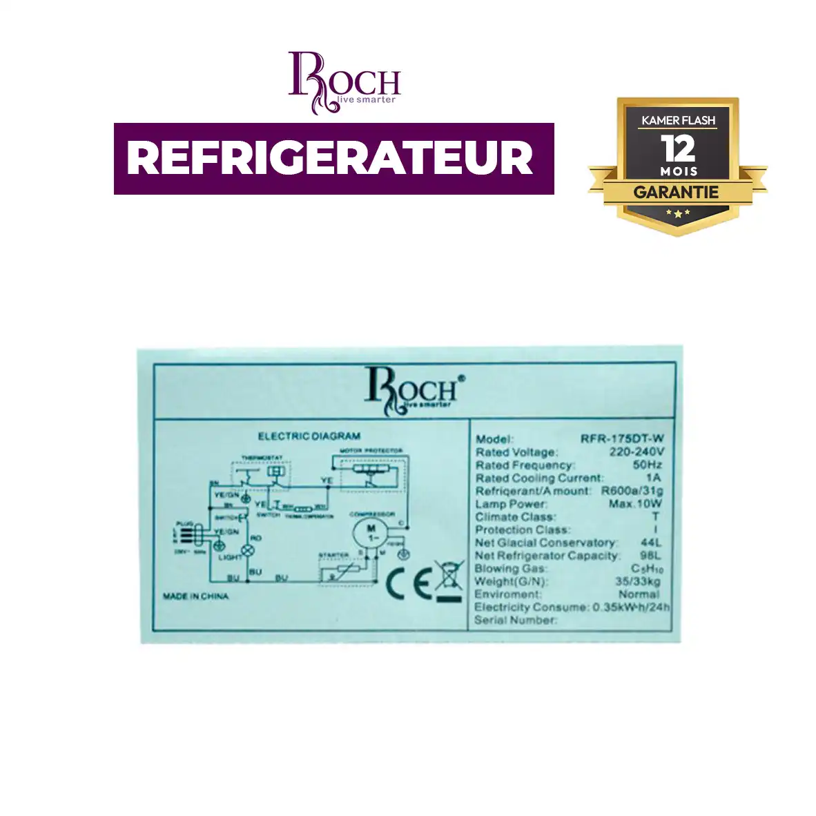 REFRIGIRATEUR DOUBLE BATTANT – ROCH RFR-175DT-W – 142 LITRES GARANTIE 12 MOIS